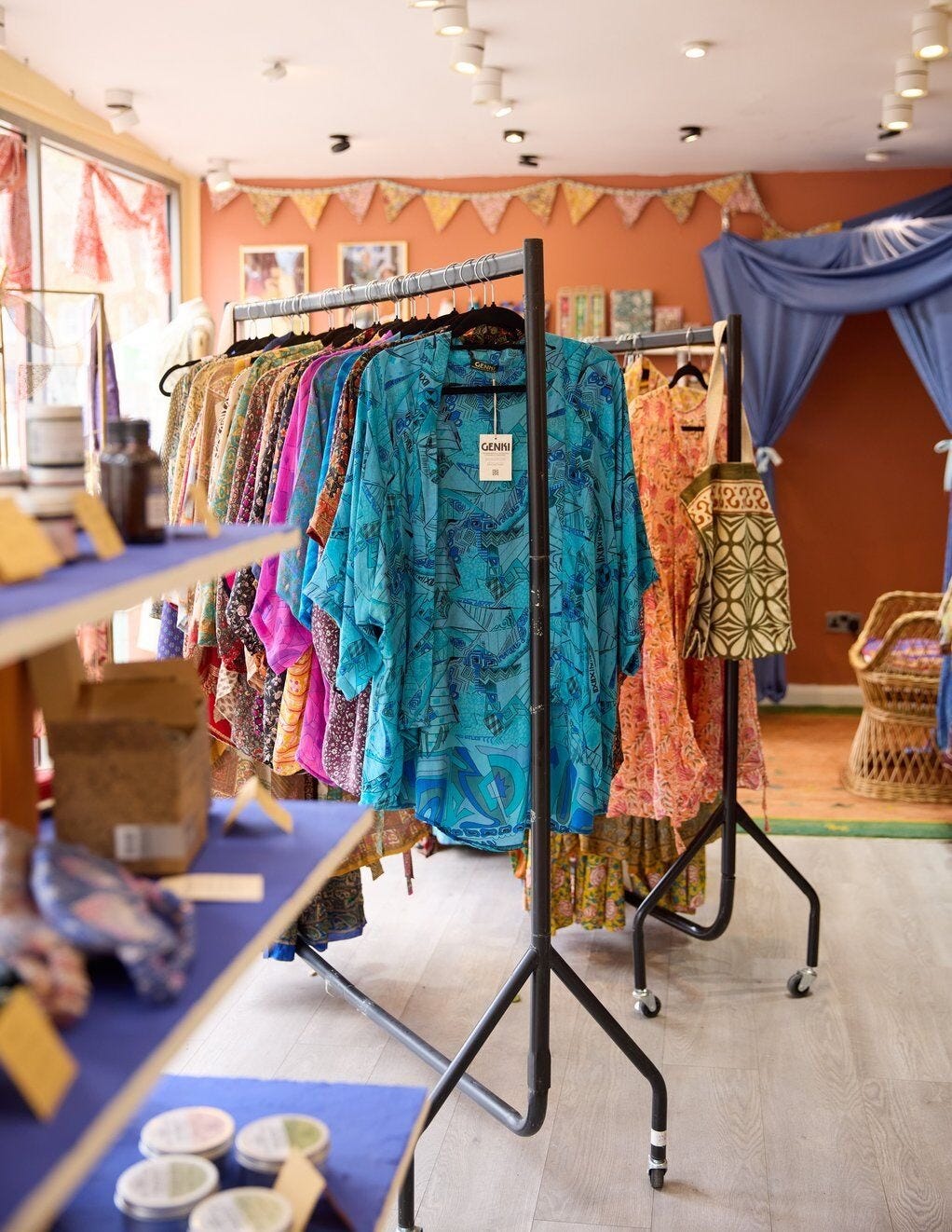 Everything in the shop is handmade, using recycled or vintage textiles: old silk saris, organic cotton, hand-dyed indigo, block prints, quilted Kantha cloth. The aesthetic is loose and layered, as in long robes, wide-leg trousers, wrap tops and roomy dresses. Pieces are cut to move in, to feel comfortable in, to wear in your own way. The standouts are undoubtedly the jumpsuits, with long halter tops that can be styled in multiple ways. Most are unisex without announcing it, just easy shapes, generous fits and sumptuous fabrics.