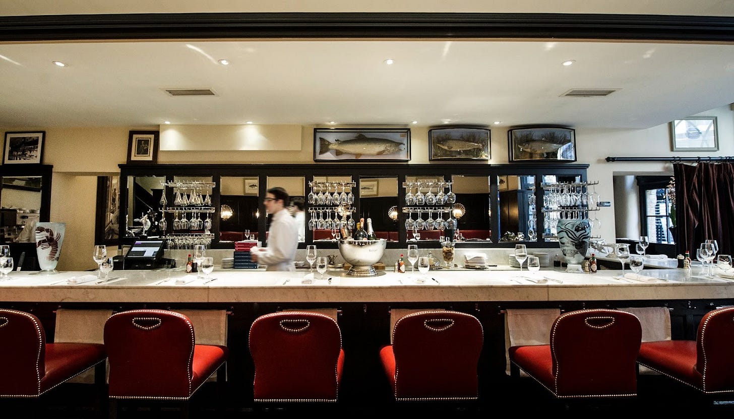 Bentley’s Oyster Bar and Grill (Mayfair, above), buzzing marble-topped oyster bar, chat w/ master shuckers while you sample, or take masterclass to shuck your own