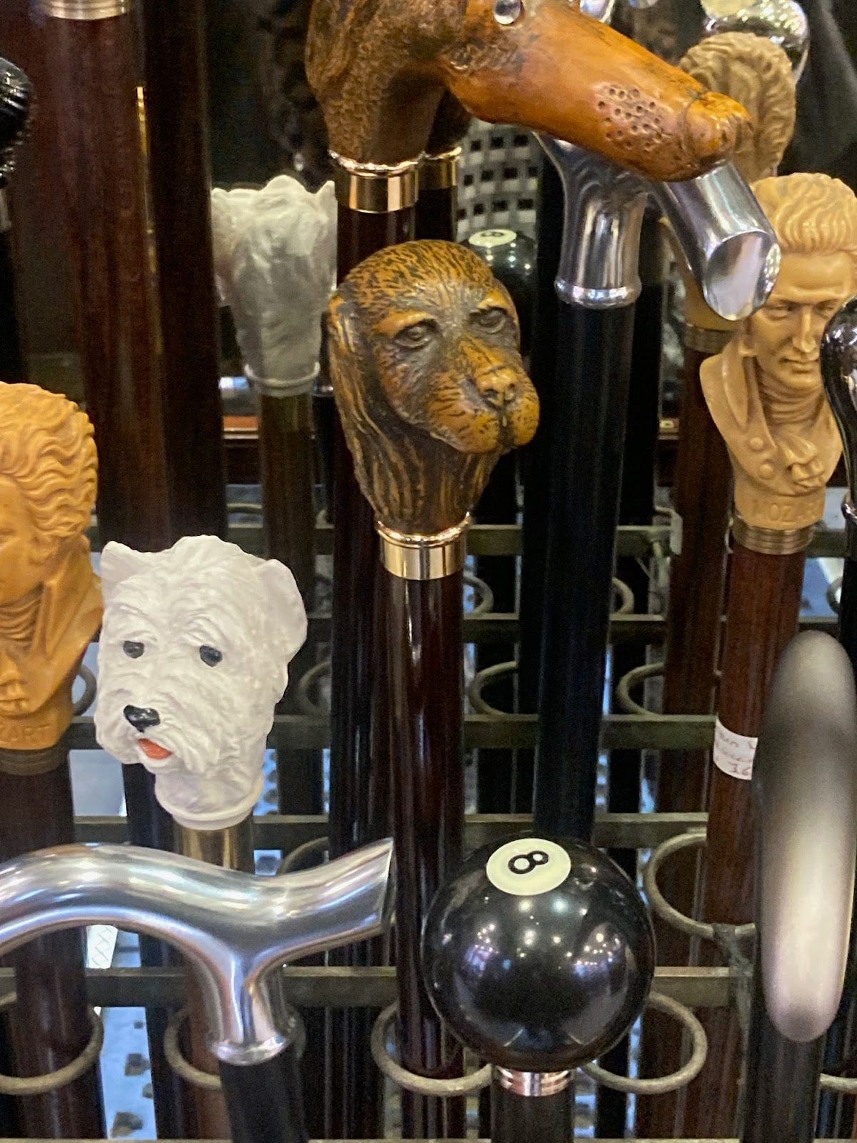 The shelves and racks are lined with an astonishing variety of umbrellas, from timeless classics to bold, artistic designs, butch to avant-garde, catering to all tastes and budgets. Which handle best represents me: a magic eight ball or a bull dog? A silver snake handle or a small wooden owl? The staff are as charming as the collection, ready to guide you through their curated offering or provide repair services for the beloved or well used.