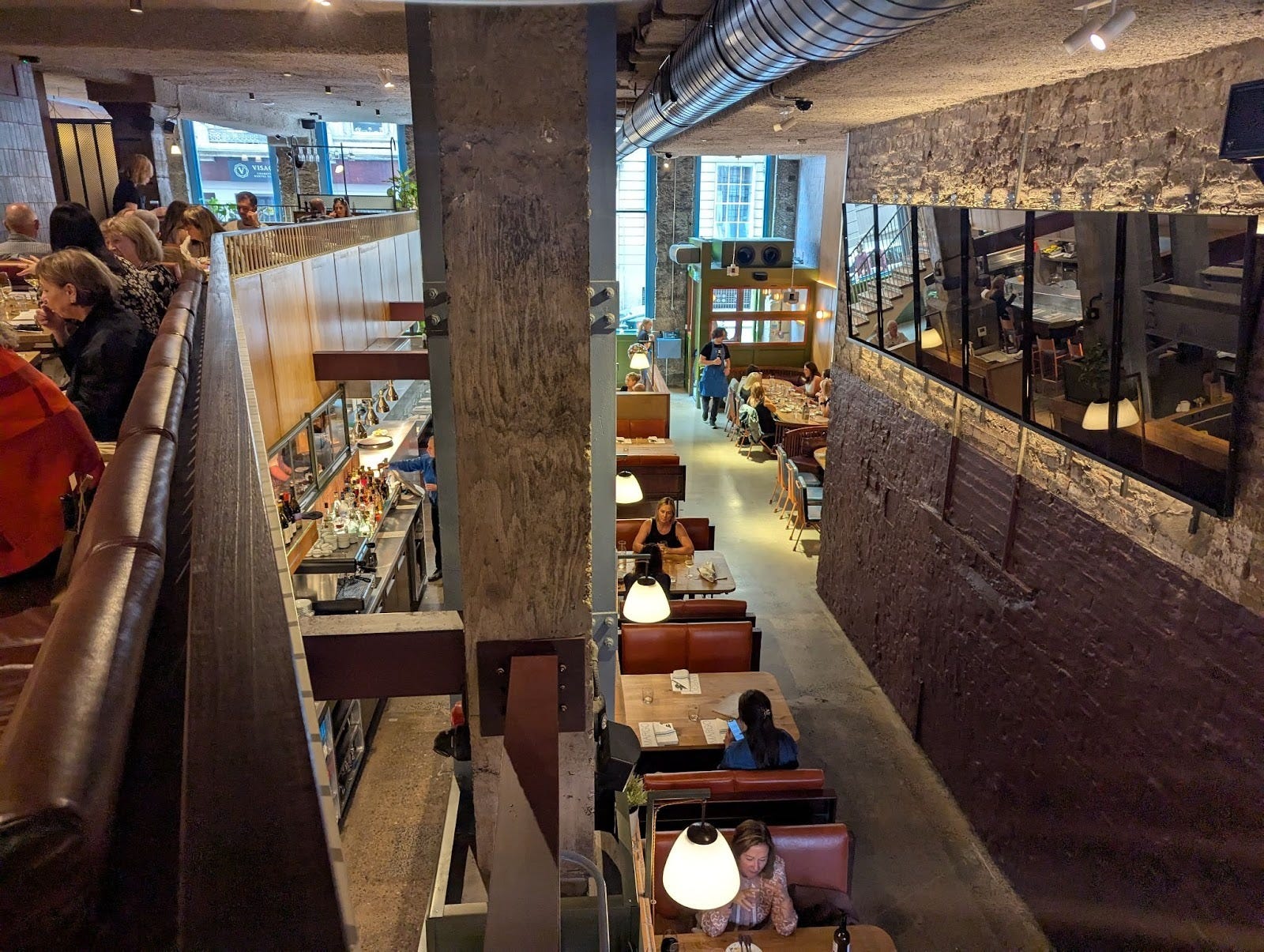 There’s a real range of seating in this vast former warehouse, including family-sized booths and huge banquettes. Some of the counter seats drift into a thoroughfare at the very end of the bar, with no real kitchen view. We found the mezzanine level warmer and more vibey, while service was super-friendly throughout.